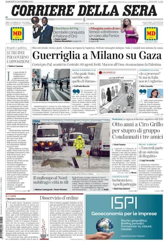 Sulle prime pagine dei principali quotidiani nazionali troviamo gli scontri a Milano durante le manifestazioni per Gaza. In tutta Italia cortei pacifici e oltre 500mila persone in piazza per la pace. Spazio anche al riconoscimento da parte della Francia dello Stato di Palestina. In primo piano anche il processo a Ciro Grillo, condannato a 8 anni per stupro di gruppo. E ancora, il maltempo che ha causato numerosi danni al Nord