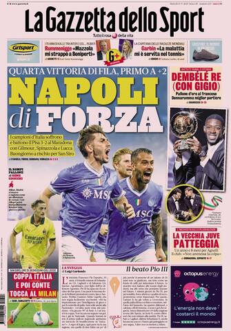 - "Napoleader" è l'apertura del Corriere dello Sport sulla vittoria del Napoli che "batte il Pisa e stacca la Juve", è il "quarto successo di fila". Spazio anche alla vittoria di Ousmane Dembélé del Pallone d'oro, Yamal secondo e Donnarumma nono. In prima pagina anche il Milan, via ai sedicesimi con tre gare: "Allegri lancia Nkunku". Le parole di Acerbi sul "no all'ex ct Spalletti": "Mai rifiutata l'Italia"