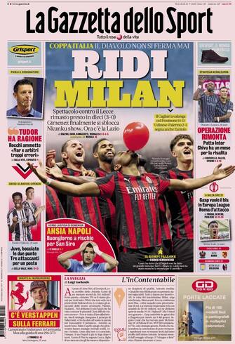 - "Ridi Milan". In Coppa Italia "il Diavolo non si ferma mai" e supera il Lecce per 3-0. Gimenez "finalmente si sblocca". Anche Cagliari e Udinese proseguono nel torneo, dopo le vittorie contro Frosinone e Palermo. Inter: "Operazione rimonta. Chivu ha un mese per la risalita". Rocchi ammette gli errori recenti degli arbitri: "Tudor ha ragione". Juve: "Bocciate le due punte". Napoli: "Buongiorno a rischio per San Siro". Roma: "Gasp vuole il bis in Europa League"