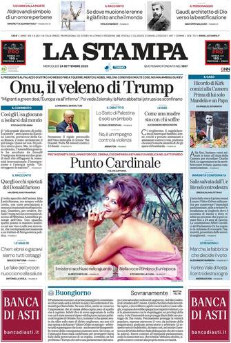 - "Onu, il veleno di Trump" titola in prima pagina il quotidiano torinese. Il presidente Usa al Palazzo di vetro: "Ho messo fine a 7 guerre, merito il Nobel". Poi vede Zelensky: "La Nato abbatta jet russi se sconfinano". Riflessione, poi, sui "comizi alla Camera" nel ricordo di Charlie Kirk e su Ilaria Salis "salvata dall'Ue". Fotonotizia dedicata alla morte di Claudia Cardinale, "protagonista degli anni d'oro del cinema" e scomparsa all'età di 87 anni