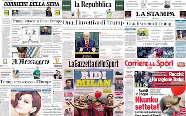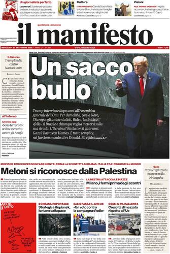 - "Onu, l'invettiva di Trump" è il titolo di apertura con attenzione sullo "schiaffo all'Assemblea generale" del tycoon. "Ho fermato 7 guerre, le Nazioni Unite nessuna. E finanziano l'immigrazione illegale", ha detto il presidente Usa, accusando anche l'Europa ("Smetta di comprare gas russo"). Intanto arriva la "mossa di Meloni alla Palestina" con il "riconoscimento a due condizioni". Spazio al "primo sì all'immunità per Ilaria Salis" e alla morte di Claudia Cardinale, "bellezza ribelle del cinema italiano"
