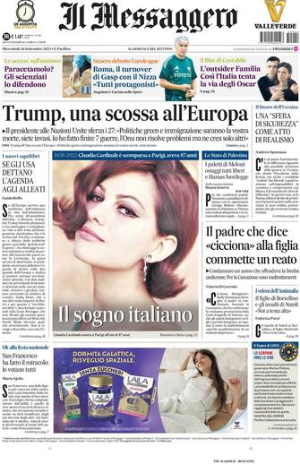 - "Trump, una scossa all'Europa". Il presidente Usa alle Nazioni Unite sferza i 27: "Politiche green e immigrazione saranno la vostra morte, siete invasi. Io ho fatto finire 7 guerre. L'Onu non risolve problemi ma ne crea solo altri". Palestina, i "paletti" di Meloni: "Ostaggi tutti liberi e Hamas fuorilegge". Fotonotizia centrale dedicata alla morte di Claudia Cardinale, simbolo del cinema e "sogno italiano", scomparsa all'età di 87 anni