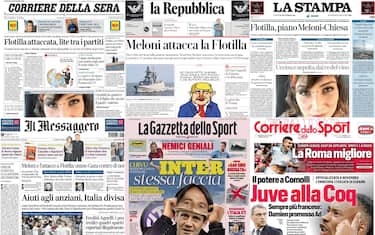 Sulle prime pagine dei principali quotidiani nazionali troviamo "l'attacco di Meloni alla Flotilla" che ha definito "irresponsabile usare Gaza contro il governo". A seguito del nuovo attacco alle imbarcazioni della missione, il ministro Crosetto ha inviato una fregata. Spazio anche alla cronaca con l'omicidio di Cinzia Pinna, la donna scomparsa a Palau l'11 settembre: l'imprenditore vinicolo Ragnedda ha confessato. In primo piano anche la firma di 4 decreti di grazia da parte del presidente Mattarella