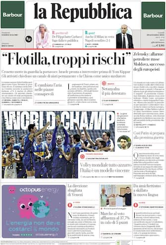 - 'Flotilla, troppi rischi' è anche il titolo di Repubblica, con Crosetto che mette in guardia la portavoce della spedizione. Gli attivisti chiedono un canale di aiuti permanente e la Chiesa come unico mediatore. Anche qui in veidenza l'impresa della Nazionale italiana di pallavolo, mentre trovano spazio pure l'allarme di Zelensky sulle petroliere russe e il successo degli europeisti in Moldavia