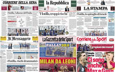 - Aperture ancora una volta monopolizzate dal caso Flotilla, che occupa la gran parte delle prime pagine dei quotidiani in edicola oggi. 'Flotilla, l'allarme dell'Italia' scrive il Corriere della Sera, riportando le parole del ministro della Difesa Crosetto che ha parlato di "rischi elevatissimi". A centro pagina fotonotizia per l'impresa degli Azzurri del volley, che bissano il successo delle ragazze e si confermano campioni del mondo