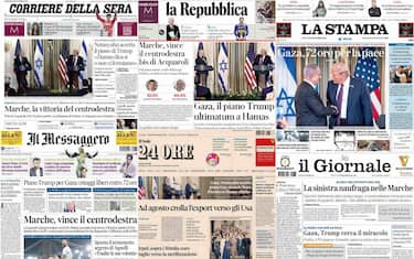Sulle prime pagine dei principali quotidiani italiani di oggi l’attenzione è rivolta a Gaza, con Netanyahu alla Casa Bianca che ha detto sì ai 20 punti del piano Trump: ostaggi liberi in 72 ore, governo provvisorio per Gaza diretto da Usa e Blair, poi le condizioni per uno Stato. Ampio spazio è riservato anche alle elezioni regionali nelle Marche, dove il centrodestra mantiene la guida con Acquaroli di Fdi (52,5%). Affluenza però al 50%, in calo di 10 punti sul 2020