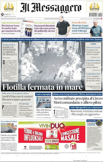 - Fotonotizia a tutta pagina degli attivisti della Flotilla anche sulla prima pagina del Messaggero. Tra le prime persone a essere identificate anche Greta Thunberg. Il governo italiano a Tel Aviv: niente violenze. In Italia i pro Pal bloccano le stazioni, domani sciopero generale