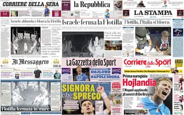 - 'Israele ferma la Flotilla' scrive anche La Repubblica a corredo di un'immagine degli attivisti con la mani alzate dopo l'arrivo dell'esercito israeliano sulle barche dell'iniziativa umanitaria. Idranti, esplosioni e barche sequestrate. Tajani: "Persone fermate saranno trasferite ad Ashdod e poi espulse"