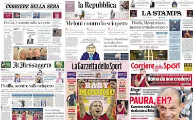 - "Flotilla, scontro sullo sciopero". Oggi l'Italia si ferma, il Garante: "Astensione illegittima". I sindacati: "Andiamo avanti". Meloni: "Rivoluzione? Vogliono il weekend lungo". Scontri nelle piazze e treni bloccati. Copenaghen: "Putin vuole colpire la Ue". Lo zar replica: "Assurdo". Orrore a Manchester: "Attacco alla sinagoga, tre morti e tra loro anche l'attentatore". Test antidroga in auto: "Chi si rifiuta commette un reato". Europa League: "Beffa Roma, rigore sbagliato tre volte".