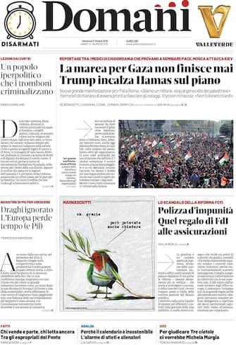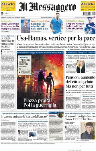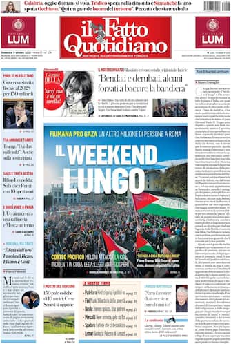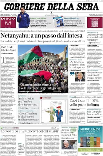 Aperture dei giornali dedicate al corteo pro-Gaza di Roma. "Siamo un milione, fermate il genocidio", hanno affermato gli organizzatori. Durante la protesta, si sono registrati cori contro Israele e uno striscione inneggiante al 7 ottobre; presente qualche vessillo di Hamas e Hezbollah tra le migliaia di bandiere palestinesi. Una minoranza di manifestanti ha poi scatenato una guerriglia, con 41 feriti tra le forze dell'ordine. Lunedì 6 ottobre, in Egitto, prendono il via i negoziati per la pace nella Striscia