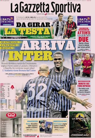 - Troppo... Bonny: un gol e tre assist a San Siro, travolta la Cremonese. Il talento francese strega il Meazza: segna e costruisce anche le reti di Lautaro, Dimarco e Barella. Il poker nerazzurro vale la quinta vittoria di fila tra campionato e Champions League: Chivu aggancia per una notte il gruppo delle prime, con Milan, Napoli e Roma. Torna Juve-Milan, la notte dei sogni: tutto dipenderà dai colpi di Yildiz e Pulisic. Tudor carica: "Il pareggio non mi basta". Allegri contro il suo passato: "Otto anni faranno effetto"