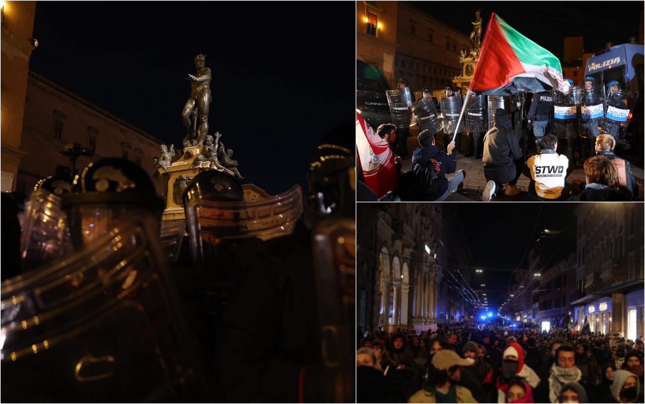 A Bologna, un manifestante è stato fermato e accompagnato in Questura per accertamenti. Dopo gli scontri in Via Rizzoli e i getti d'acqua degli idranti in Via Ugo Bassi il gruppo di manifestanti si è poi spostato in corteo verso le Due Torri, per imboccare Strada Maggiore, seguiti dal mezzo con gli idranti e i blindati delle forze dell'ordine. La manifestazione è andata avanti fino a tarda sera, quando il corteo si è sciolto. Prima degli scontri, al megafono la Polizia si era rivolta ai manifestanti ricordando che "il corteo non è autorizzato" e intimando di "lasciare la piazza alla spicciolata". Il volantino che ha circolato sui social portava il titolo “Viva il 7 ottobre, Viva la resistenza palestinese". Dopo giorni di polemiche, l'iniziativa era stata formalmente vietata dal Questore di Bologna, mentre anche il Comune aveva chiesto di non svolgerla. Nonostante il divieto, gli organizzatori hanno deciso di mantenere la presenza in piazza, con l'adesione di Potere al Popolo e dei collettivi Cua, Cambiare Rotta e Osa. Sequestrate casse e microfoni al raduno.