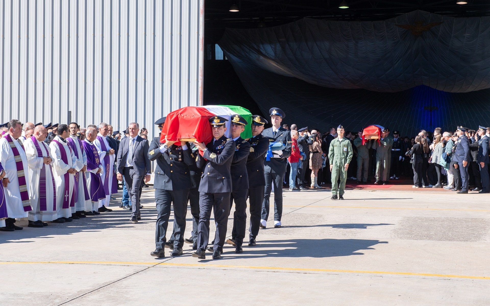 Martedì mattina sono stati celebrati i funerali del Generale di Brigata Aerea Simone Mettini e dell’Allievo Ufficiale Pilota Lorenzo Nucheli, scomparsi nell'incidente aereo avvenuto lo scorso primo ottobre durante una missione di addestramento a bordo di un velivolo T-260 B. Al rito funebre ha partecipato anche il Ministro della Difesa Guido Crosetto.