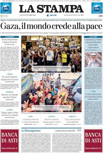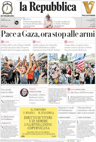 - In apertura la "pace a Gaza" e il raggiungimento dell'accordo per il cessate il fuoco: "Ora stop alle armi". Trump esulta: "Giorno storico, nessuno costretto a lasciare la Striscia". Intanto, Netanyahu dà il via libera: "I falchi dell'ultradestra si sfilano". Dopo 734 giorni di guerra, "la firma dell'accordo a Sharm el-Sheikh" e "lunedì il rilascio di ostaggi e prigionieri". In prima pagina anche il caso Almasri: "Lo scudo del Parlamento ai ministri indagati". E ancora il caso Garlasco: "Corruzione e favori agli ex procuratori"