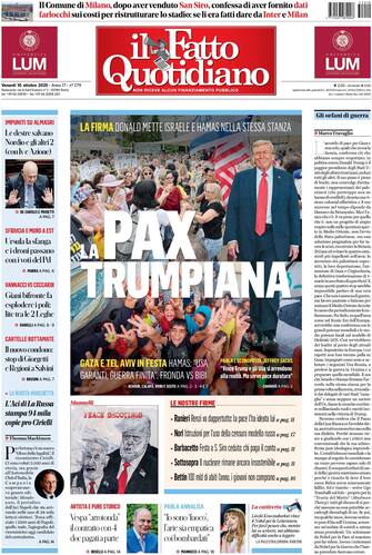 - "La pax trumpiana" è il titolo d'apertura del Fatto Quotidiano sul raggiungimento dell'accordo per il cessate il fuoco a Gaza. "Donald mette Israele e Hamas nella stessa stanza". Mentre è festa a Gaza e a Tel Aviv, Hamas annuncia: "Usa garanti, guerra finita". Le parole dell'economista Jeffrey Sachs: "Vince Trump e gli Usa si arrendono alla realtà. Ma serve pace duratura". Spazio in prima pagina anche al caso Almasri: "Le destre salvano Nordio e gli altri 2 (con Iv e Azione)