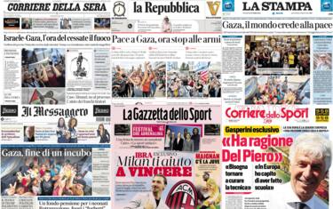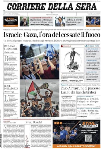 Sulle prime pagine dei principali quotidiani nazionali, il raggiungimento dell'accordo per il cessate il fuoco a Gaza. Donald Trump annuncia il "rilascio di ostaggi e prigionieri lunedì" e promette "una pace per sempre". Festeggiamenti nella Striscia e a Tel Aviv dopo la notizia. Spazio anche al caso Almasri, con il "no" al processo. E ancora il caso Garlasco, con l'inchiesta sull'ex procuratore Venditti: sarebbe indagato anche un altro pm. Il Nobel per la Letteratura va allo scrittore ungherese Krasznahorkai