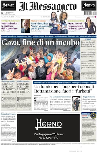 - A Gaza è "la fine di un incubo". Questo il titolo del Messaggero sul raggiungimento di un accordo sul cessate il fuoco nella Striscia. "Ostaggi liberi a inizio settimana", mentre Trump annuncia che "sarà una pace durevole". Spazio anche al caso Almasri: "Niente processo, Iv e Calenda col governo". Focus anche sulla Manovra: "Un fondo pensione per i neonati". E sulla Rottamazione, "fuori i 'furbetti'". Infine, l'omicidio a Pescara: "Spara alla moglie in mezzo alla gente, terrore in strada"