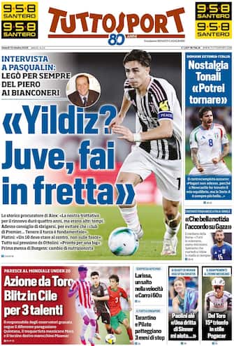 - In apertura l'intervista a Pasqualin, colui che "legò per sempre Del Piero ai bianconeri": "Yildiz? Juve, fai in fretta". Spazio anche all'appuntamento di domani con Italia-Estonia: "Nostalgia Tonali: 'Potrei tornare'". Le parole di Cristiane prima dell'appuntamento Italia-Israele: "Che bella notizia l'accordo su Gaza". In prima pagina anche l'atletica, con Larissa Iapichino: "Un salto nella velocità: 'Corro i 60'". Infine, il tennis con Paolini, che sfida Swiatek ai quarti di Wuhan: "Una dritta di Sinner mi aiuta..."