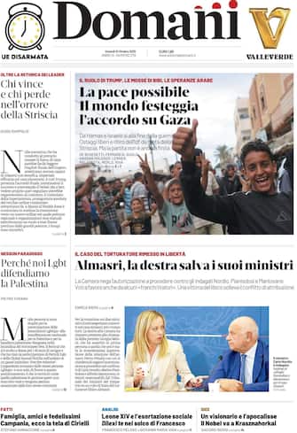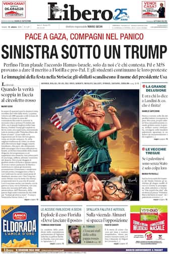 - "Sinistra sotto un Trump" è il titolo in prima pagina di Libero dopo la tregua a Gaza. "Solo da noi c'è chi contesta. Pd e M5S provano a dare il merito a Flotilla e pro-Pal", scrive il quotidiano. Intanto nella Striscia, "immagini della festa": "gli sfollati scandiscono il nome del presidente Usa". L'editoriale di Mario Sechi sulla questione: "Quando la verità scoppia in faccia al circoletto rosso". Infine, il caso Almasri: "Sulla vicenda si spacca l'opposizione"