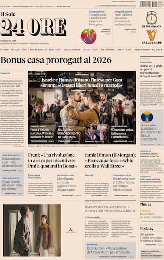 - In primo piano la Manovra: "Bonus casa prorogati al 2026". In prima pagina anche all'accordo tra Israele e Hamas per il cessate il fuoco a Gaza. Trump annuncia: "Ostaggi liberi lunedì o martedì". La premier Meloni: "Occasione unica, Italia pronta a contribuire". Spazio anche all'intervista a Federico Freni: "Una rivoluzione in arrivo per incentivare Pmi a quotarsi in Borsa". E poi le parole di Jamie Dimon (JPMorgan): "Preoccupa forte rischio crollo a Wall Street"