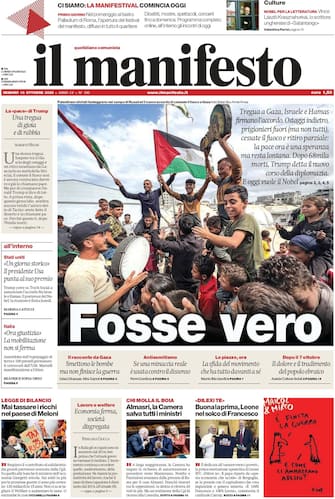 - "Fosse vero". Così scrive Il Manifesto in prima pagina dopo l'accordo di cessate il fuoco a Gaza. "La pace ora è una speranza ma resta lontana. Dopo 68mila morti, Trump detta il nuovo corso della diplomazia. E oggi vuole il Nobel". Spazio anche al racconto da Gaza: "Smettono le bombe ma non finisce la guerra". E l'editoriale di Alberto Negri: "Una tregua di gioia e di rabbia". Focus anche sul caso Almasri: "La Camera salva tutti i ministri". E infine, la legge di bilancio: "Mai tassare i ricchi nel paese di Meloni"