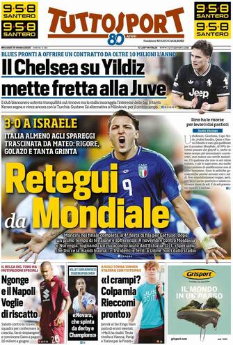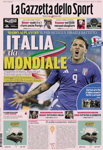 - Il titolo principale “Italia da Mondiale”, dopo la vittoria 3-0 contro Israele che vale i playoff. Sottotitolo “Doppietta di Mateo, Mancini gol. Il secondo posto è sicuro. Sorteggio il 21 novembre. A marzo si decide il nostro futuro”. Spazio anche al “Corteo pro-Pal a Udine, scontri feriti e arresti”. In taglio alto, focus su Jannik Sinner “Vuole il n.1: ‘Farò anche Parigi’” e su Vasseur “Nel 2026 non può sbagliare”. Spazio anche a “Modric tutto per il Milan” e a “Chivu tutto per lo Scudetto”
