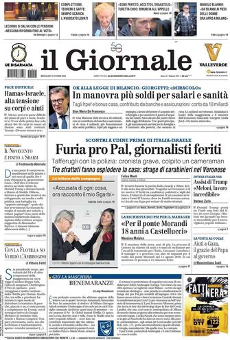 - In primo piano “in manovra più soldi per salari e sanità”, con Giorgetti che definisce l’intervento “un miracolo”. In primo piano anche “Hamas-Israele, alta tensione su corpi e aiuti” e gli “scontri a Udine prima di Italia-Israele”. Spazio anche al racconto della tragedia di Verona: “Tre sfrattati fanno esplodere la casa, strage di carabinieri nel Veronese”. E alla rinuncia di Turetta all’appello: “sono pentito, accetto l’ergastolo”