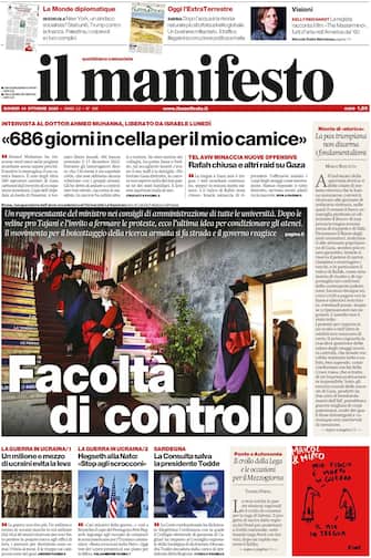 - "Facoltà di controllo" è il titolo in prima pagina del Manifesto sulle università italiane sull'idea di istituire "un rappresentante del ministro nei consigli di amministrazione di tutte le università". Spazio anche all'intervista al medico Ahmed Muhanna, liberato da Israele: "686 giorni di cella per il mio camice". Nel frattenmpo, "Rafah chiusa e altri raid su Gaza". In prima pagina anche l'Ucraina con "un milione e mezzo di ucraini" che "evita la leva" e le parole di Hegseth alla Nato: "Stop agli scrocconi"