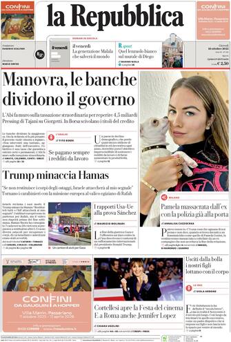 - In primo piano la Manovra: "Le banche dividono il governo". L'Abi "fa muro sulla tassazione straordinaria per reperire 4,5 miliardi". Intanto, "pressing di Tajani su Giorgetti". Spazio anche al Medio Oriente con Trump che minaccia Hamas: "Se non restituisce i corpi degli ostaggi, Israele attaccherà al mio segnale". In prima pagina anche il femminicidio di Pamela Genini a Milano, uccisa dal compagno in casa con "la polizia già alla porta". Infine, Paola Cortellesi apre la Festa del Cinema di Roma