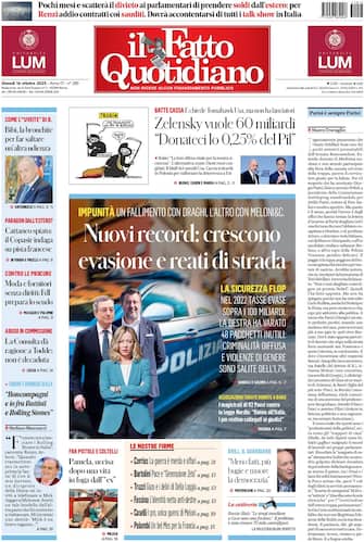 - "Crescono evasione e reati di strada" è l'apertura del Fatto Quotidiano. Nel 2022 "tasse evase sopra i 100 miliardi. La destra ha varato 48 pacchetti inutili: criminalità diffusa e violenze di genere sono salite dell'1,7%", riferisce il quotidiano. Spazio anche all'Ucraina, con Zelensky che "vuole 60 miliardi": "Donateci lo 0,25% del Pil". In prima pagina anche il femminicidio di Pamela Genini, "uccisa dopo una vita in fuga dall'ex"