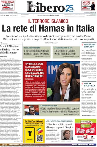 - "La rete di Hamas in Italia" è l'apertura di Libero dedicata a uno studio statunitense secondo cui "i palestinesi hanno da anni basi operative nel nostro Paese", con "miliziani armati pronti a colpire". In prima pagina anche le parole di Appendino che avverte Conte sul campo largo: "Pronta a dare le dimissioni". Focus anche sulla Manovra, con l'intervento di Claudio Durigon (Lega): "Ceto medio e fasce deboli al centro, così abbiamo costruito la Manovra"