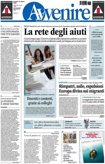 - "La rete degli aiuti" è l'apertura dedicata al piano di interventi a Gaza: "Priorità ad alimenti e sanità, poi l'impegno per la ricostruzione". Spazio anche al reportage di Nello Scavo: "Raid e colonie, in Cisgiordania dove la tensione resta massima". In prima pagina anche la scuola e la condizione degli insegnanti: "Docenti e contenti, grazie ai colleghi". Focus sui migranti: "Rimpatri, asilo, espulsioni: Europa divisa". In prima pagina anche il femminicidio di Pamela Genini: "Un altro femminicidio, un altro allarme a vuoto"