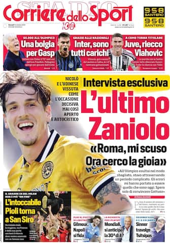 - In primo piano l'appuntamento di domenica con Como-Juve e "la sfida tra i due talenti in acesa": "Paz-Yildiz futurshow". Spazio poi all'intervista a Patrick Vieira sul Golden Boy 2025: "Giocate per strada e riavrete Alex&Totti". E ancora: "Per allevare un giovane talvolta si possono sacrificare i tre punti". In prima pagina anche il Torino con Zapata, "un Toro da 30 minuti". E poi, il tennis con "rullo Sinner" che travolge Tsitsipas 6-2 6-3 e "stasera test Djokovic"