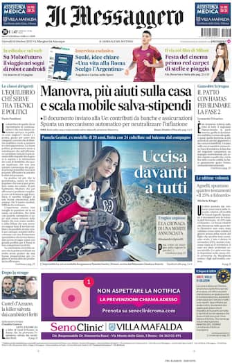 - In apertura la Manovra: "Più aiuti sulla casa e scala mobile salva-stipendi". Il documento è stato "inviato alla Ue". In primo piano anche il femminicidio di Pamela Genini, 29 anni, uccisa dal compagno con 24 coltellate sul balcone di casa a Milano: "Uccisa davanti a tutti". Spazio anche al Medio Oriente con l'approfondimento di Leonardo Tricarico: "Il patto con Hamas per blindare la fase 2". E l'editoriale di Paolo Pombeni: "L'equilibrio che serve tra tecnici e politici"