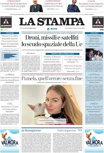 - La difesa europea domina l'apertura: "Droni, missili e satelliti: lo scudo spaziale della Ue". La Commissione Ue si rivolge agli Stati membri: "Raddoppiate gli acquisti comuni sulla difesa". Intanto Trump minaccia Hamas: "Si disarmi o Israele attacca". In primo piano anche il femminicidio di Pamela Genini a Milano: "Quell'orrore senza fine". Focus sull'economia e sulla Manovra con lo "stop delle banche": "No a nuove tasse". Infine, il "terremoto" nel M5S, con Appendino che sfida Conte: "Col Pd perdiamo"