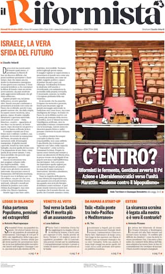 - Apertura politica per Il Riformista: "C'entro?". "Riformisti in fermento, Gentiloni avverte il Pd", mentre "Azione e Liberaldemocratici verso l'unità". Marattin: "Insieme contro il bipopulismo". In primo piano anche l'editoriale di Claudio Velardi sulla situazione in Medio Oriente: "Israele, la vera sfida del futuro". E le parole dell'ambasciatore Talò: "Italia ponte tra Indo-Pacifico e Mediterraneo". Spazio anche alla legge di bilancio: "Falsa partenza: populismo, pensioni ed extraprofitti"