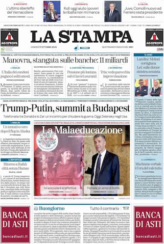 - In primo piano la guerra in Ucraina: “Trump-Putin, summit a Budapest”, “Telefonata tra Donald e lo Zar: un incontro per chiudere la guerra. Oggi Zelensky negli Usa”. Spazio anche alla “Manovra, stangata sulle banche: 11 miliardi”, con le analisi “L’Italia dei condoni paga i soliti onesti” e “Pensione più lontana, spazio ai lavori più usuranti”. E all’”Accusa di Gino Cecchettin: sbagliata la marcia indietro sull’educazione sessuale in classe”