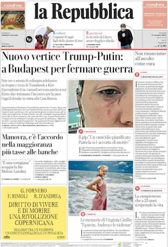 - In apertura “Nuovo vertice Trump-Putin: a Budapest per fermare guerra”, “Entro due settimane l'incontro per la pace. Oggi Zelensky in visita alla Casa Bianca”. In taglio centrale spazio alla manovra: “Manovra, c’è l’accordo nella maggioranza: più tasse alle banche”. E a "È una cortigiana" scoppia la lite