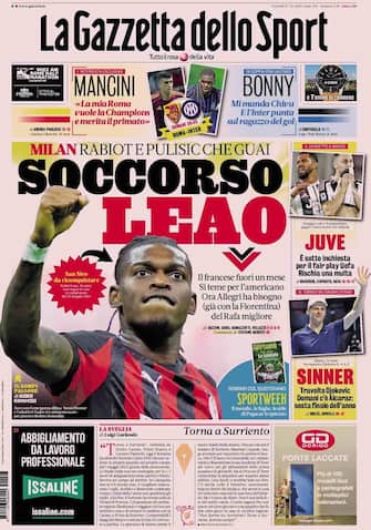 - La prima pagina è dedicata a Rafael Leao: “Soccorso Leao. Il francese fuori un mese, si teme per l’americano. Ora Allegri ha bisogno (già con la Fiorentina) del Rafa migliore”. In alto l’intervista esclusiva a Mancini: “La mia Roma vuole la Champions e merita il primato”. A destra si analizza la situazione della Juve: “Sotto inchiesta per il fair play Uefa. Rischia una multa”. Spazio anche al tennis con “Sinner. Travolto Diokovic Domani c'è Alcaraz: sesta finale dell'anno”