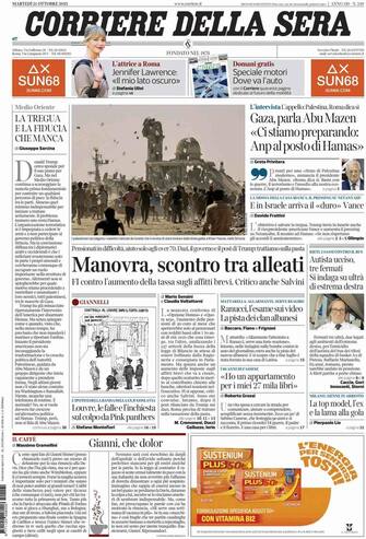 - In primo piano “La tregua e la fiducia che manca”, con un’analisi di Giuseppe Sarcina sulla crisi in Medio Oriente. In alto spazio all’intervista ad Abu Mazen: “Ci stiamo preparando: Anp al posto di Hamas”. Al centro pagina il titolo politico “Manovra, scontro tra alleati”, sui contrasti interni alla maggioranza sulla tassa per gli affitti brevi. In spalla, l’inchiesta “Ranucci, l’esame sui video: la pista dei clan albanesi” e la notizia “Autista ucciso, tre fermati. Si indaga su ultrà di estrema destra”.