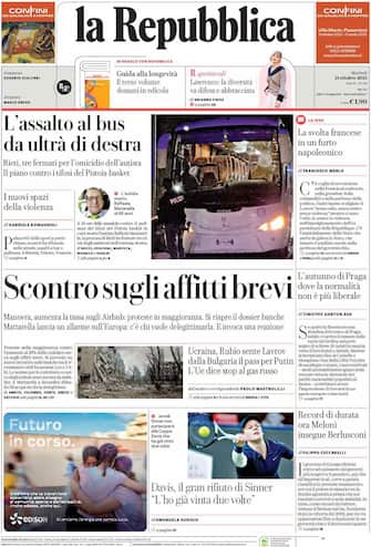 - In apertura “L’assalto al bus da ultrà di destra”, sull’omicidio dell’autista Raffaele Marianella e sull’arresto di tre persone. In primo piano anche: “Scontro sugli affitti brevi”, sulle tensioni nella maggioranza di governo sulla manovra. In evidenza a destra “La svolta francese in un furto napoleonico” e “L’autunno di Praga dove la normalità non è più liberale”. In taglio basso “Davis, il gran rifiuto di Sinner: L’ho già vinta due volte”. Spazio anche alla guerra in “Ucraina, Rubio sente Lavrov. L'Ue dice stop al gas russo”.