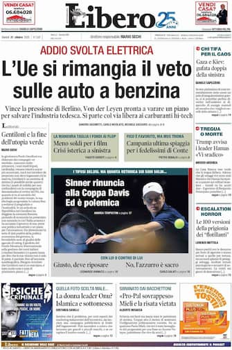 - L’apertura è su Bruxelles con il titolo “L’Ue si rimangia il veto sulle auto a benzina”, sottolineando che “vince la pressione di Berlino” e che “Von der Leyen è pronta a varare un piano per salvare l’industria tedesca”. In evidenza anche “Sinner rinuncia alla Coppa Davis ed è polemica”. In taglio alto l’editoriale “Gentiloni e la fine dell’utopia verde”. In spalla spazio a “Gaza e Kiev: gufata doppia della sinistra” e “Trump avvisa i leader Hamas: vi sradico”.