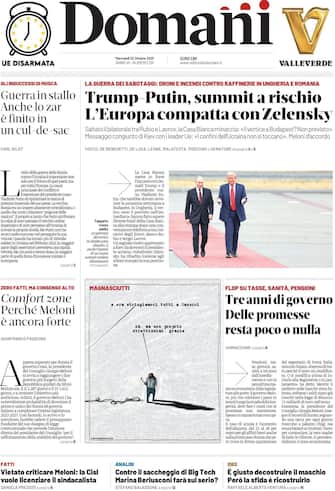 - In apertura la guerra in Ucraina e l'annullamento del summit tra Trump e Putin. Nel frattempo, l'Europa resta "compatta con Zelensky". Messaggio congiunto di Kiev con i leader Ue: "I confini dell'Ucraina non si toccano". L'editoriale di Carl Bildt: "Guerra in stallo, anche lo zar è finito in un culò-de-sac". Spazio anche al bilancio del "tre anni di governo": "Delle promesse resta poco o nulla". L'editoriale di Gianfranco Pasquino: "Comfort zone: perché Meloni è ancora forte".