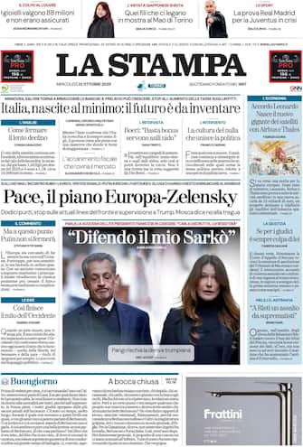 - In primo piano, la guerra in Ucraina e il piano di pace in dodici punti per Kiev proposto dall'Ue. Tra i punti, "stop sulle attuali linee del fronte e supervisione a Trump". Intanto Mosca dice no alla tregua. Spazio anche all'incarcerazione di Nicolas Sarkozy, con le parole della suocera: "Carla distrutta, lui resisterà". In prima pagina anche le "nascite al minimo in Italia": "Il futuro è da inventare". Focus economico sull'accordo Leonardo: "Nasce il nuovo gigante dei satelliti con Airbus e Thales".