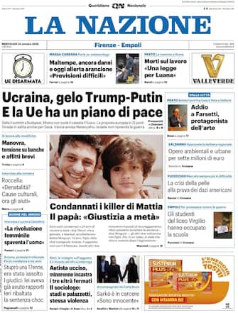 - In primo piano l'Ucraina: "Gelo Trump-Putin e la Ue ha un piano di pace". Mentre in Medio Oriente, Vance avvisa Netanyahu: "Israele non riprenda la guerra". Spazio anche alla Manovra: "Tensione su banche e affitti brevi". In prima pagina anche la condanna per i responsabili dell'omicidio del 14enne Mattia Minguzzi. Il padre: "Giustizia a metà". Focus anche sulla detanatalità, con l'intervista alla ministra Roccella: "Cause culturali, ora gli aiuti". Infine, il caso dello stupro di una 17enne ad Ancona: "Ribaltata la sentenza choc".