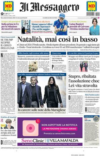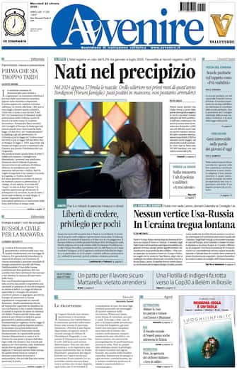 - In apertura l'allarme dell'Istat sulle nascite in Italia: "Nati sul precipizio". Nel 2024 "appena 370mila le nascite" e "crollo ulteriore nei primi mesi di quest'anno". Spazio anche alla guerra in Ucraina: "Nessun vertice Usa-Russia" e "la tregua è lontana". Spazio anche all'allarme sulla libertà di professare il proprio credo religioso: "Libertà di credere, privilegio per pochi". L'editoriale di Giuseppe Anzani sui femminicidi: "Prima che sia troppo tardi". E quello di Leonardo Becchetti sulla Manovra: "Bussola civile per la manovra".