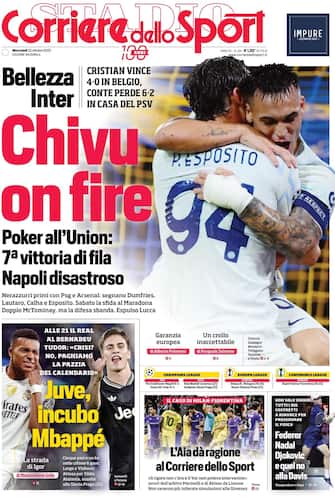 - "Chivu on fire" è il titolo in prima pagina del Corriere dello Sport sulla vittoria dell'Inter contro la Royale Union Saint-Gilloise, "7° vittoria di fila". Sabato "sfida al Maradona". Intanto, "Napoli disastroso" perde 6-2 contro il PSV. Spazio anche alla Juve: "Incubo Mbappé". Stasera i bianconeri contro il Real Madrid alle 21. Tudor: "Crisi? No, paghiamo la pazzia del calendario". Spazio anche al tennis, con il focus su "tutti i big costretti a rinunciare per preservare il fisico": "Federer, Nadal, Djokovic e quei no alla Davis".