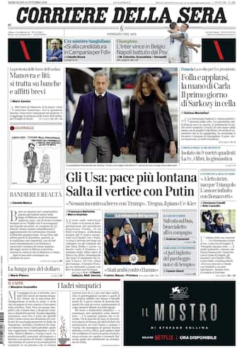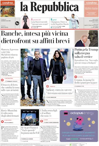 - In apertura la Manovra, con l'intesa sulle banche "più vicina" e il "dietrofront" sugli affitti brevi. Intanto, "il governo vede l'Abi ma Salvini rilancia: paghino di più". Spazio anche all'incarcerazione di Nicolas Sarkozy: "Arrestano un innocente". In prima pagina anche la guerra in Ucraina, con Putin che "gela Trump sulla tregua": "salta il vertice" tra i due. Intanto, l'Ue propone un piano in "dodici punti per la pace". Poi, il sit-in per Ranucci: "Via le querele".