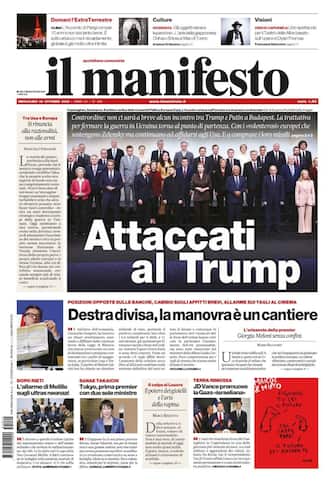 - "Attaccati al Trump" è il titolo d'apertura del Manifesto sull'annullamento del vertice tra il presidente Usa e Putin per l'Ucraina. "La trattativa per fermare la guerra torna al punto di partenza". In prima pagina anche la Legge di Bilancio: "Destra divisa, la manovra è un cantiere" con "posizioni opposte sulle banche, cambio sugli affitti brevi, allarme sui tagli al cinema". Spazio anche al Medio Oriente con JD Vance in Israele che "promuove la Gaza 'israeliana'". Infine, la prima premier giapponese Sanae Takaichi.
