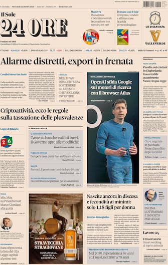 - In apertura "allarme distretti" con "l'export in frenata", secondo l'analisi di Intesa-San Paolo. Spazio anche all'intelligenza artificiale, con OpenAI che "sfida Google sui motori di ricerca con il browser Atlas". In prima pagina anche l'allarme nascite "ancora in discesa" secondo i dati Istat: "Solo 1,18 figli per donna". Focus sulla criptoattività, con le "regole sulla tassazione delle plusvalenze". Poi, gli esteri con il piano dell'Ue per la pace a Kiev. E le parole di Parolin sui cristiani in Cisgiordania: "Inaccettabile accanimento".